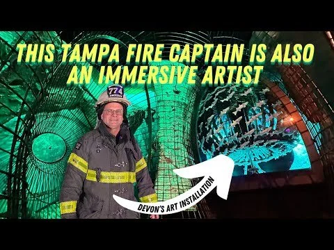Munchausen Waves made its debut at Tampa’s Gasparilla Music Festival in October of 2021. The 30-foot-long kinetic sculpture draws parallels between firefighting and ocean waves with undulating spirals of oranges and blues.